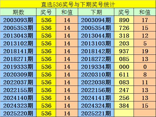 第2025220期3D奖号为:536,历史上该号码直选开出13次,下期号码辩别为:890、726、318、203、937、085、000、611、083、247、256、384。
