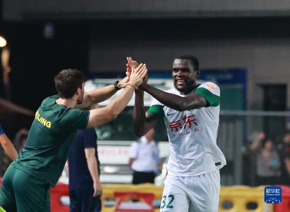 8月13日,北京国安队球员恩加德乌(右)与队友庆祝进球。新华社发(邱宇 摄)